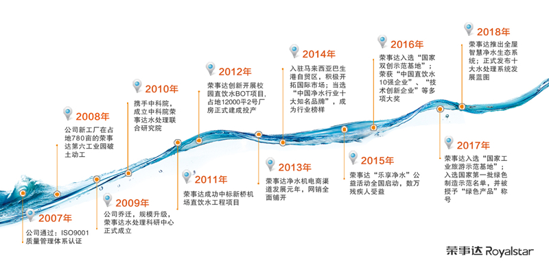 2018年5月,榮事達正式發布十大水處理系統發展藍圖,全面布局全屋智慧凈水、校園直飲水、城市公共飲水、社區智慧飲水、農村安全飲水、工業污水處理、生活污水處理、景觀水處理、醫療用水處理、海水淡化十大領域。